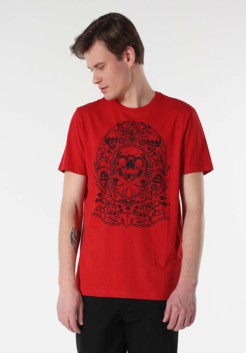 Regular Fit Yuvarlak Yaka Baskılı Cepsiz Erkek Kırmızı Kısa Kol Tişört