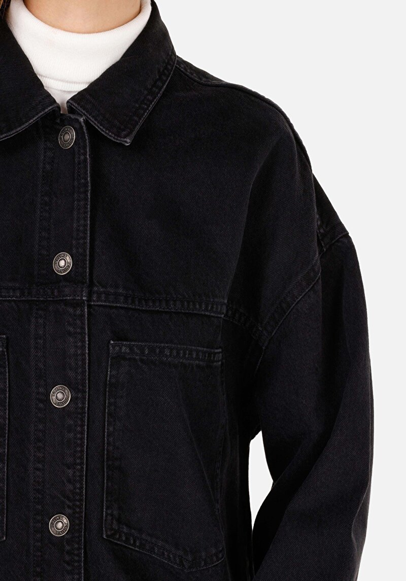 Oversize Fit Klasik Yaka Kadın Siyah Uzun Kol Gömlek
