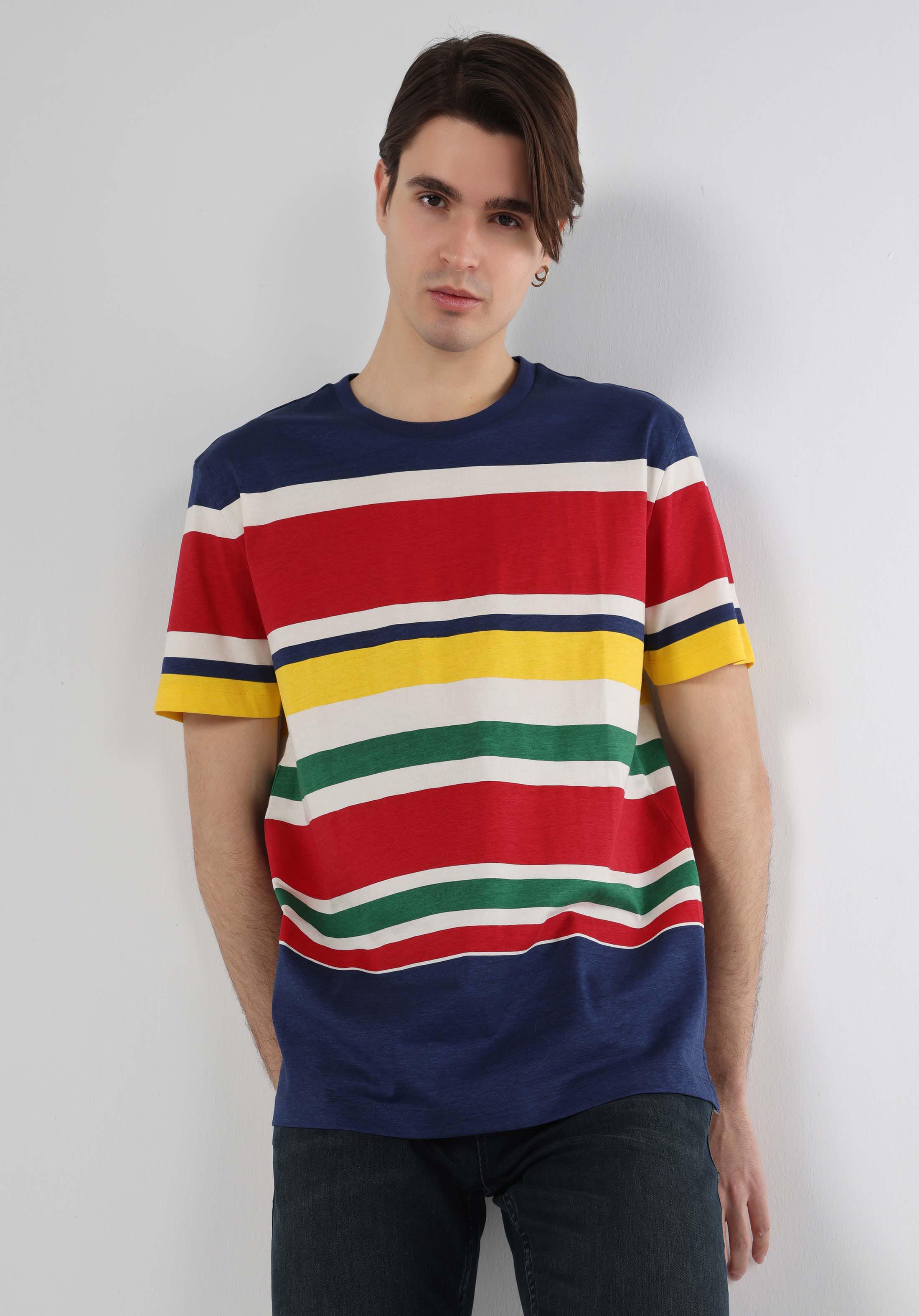 Comfort Fit Yuvarlak Yaka Çizgili Erkek Çok Renkli Kısa Kol Tişört