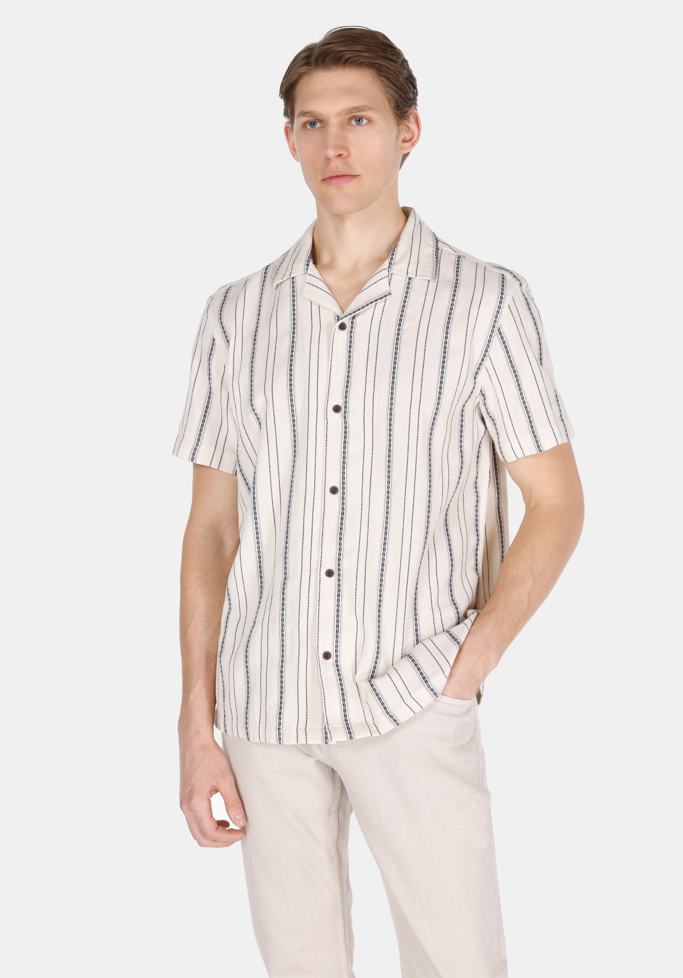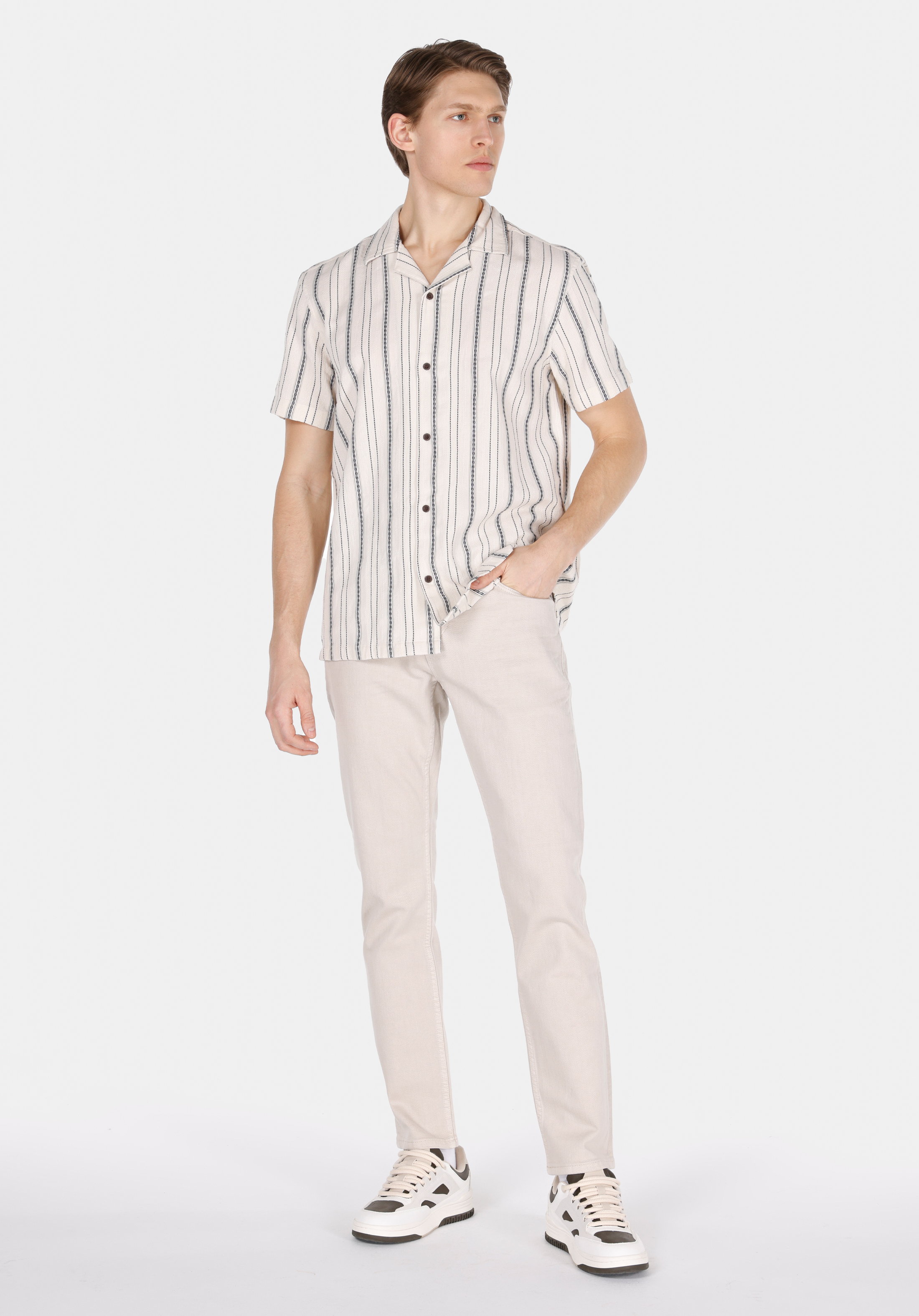 Regular Fit Shirt Neck Çizgili Erkek Ekru Kısa Kol Gömlek