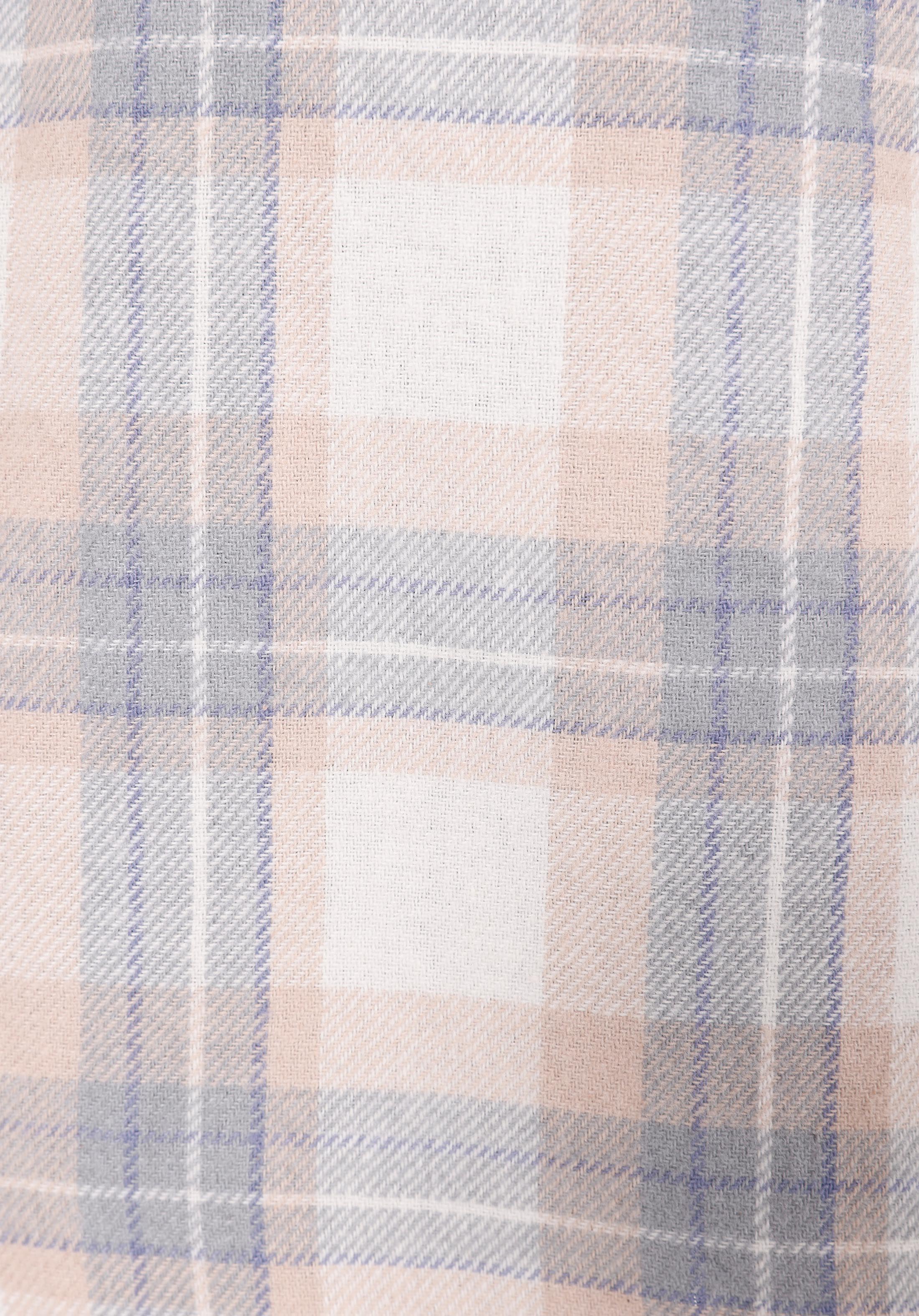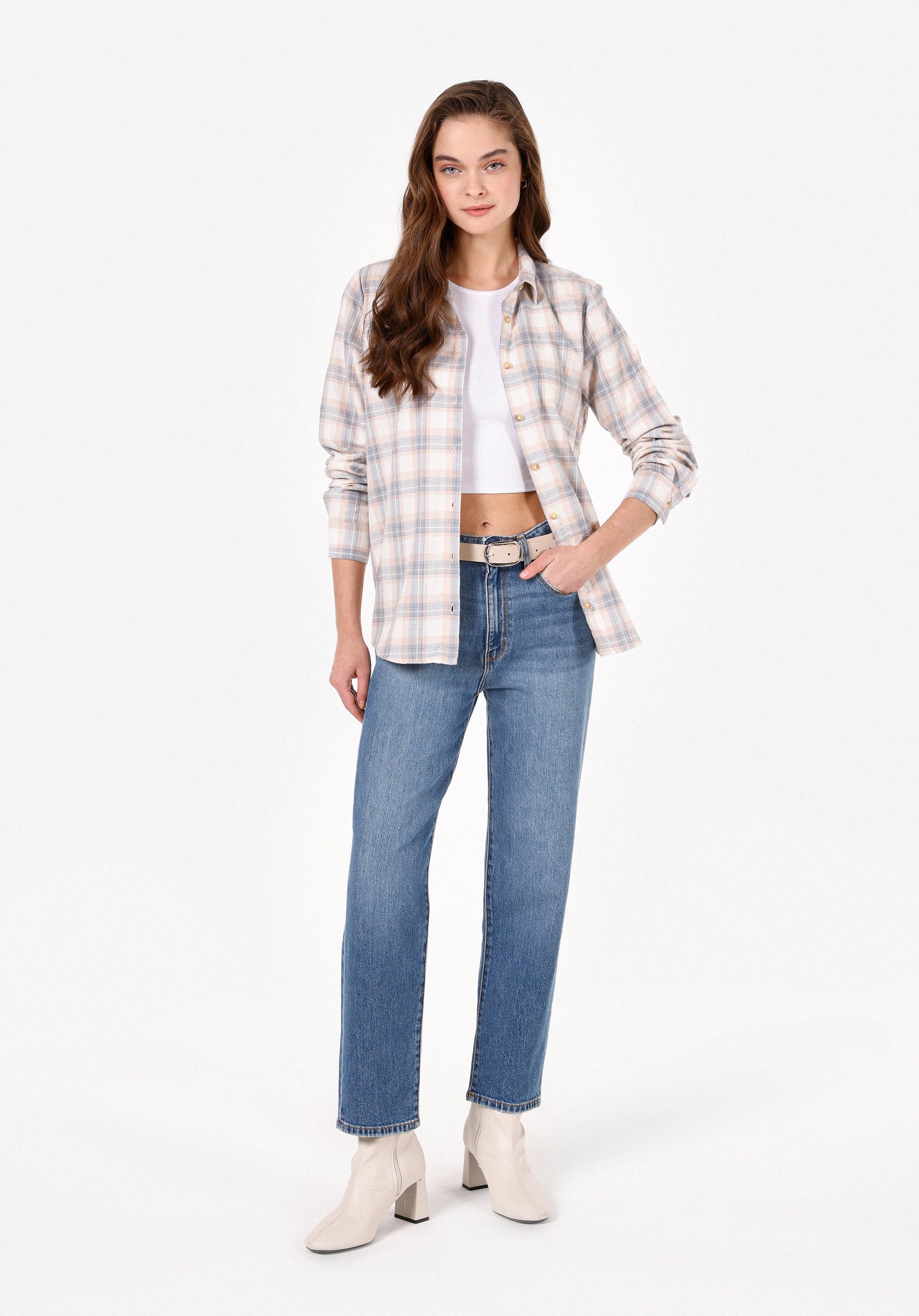 Regular Fit Shirt Neck Ekoseli Kadın Ekru Uzun Kol Gömlek