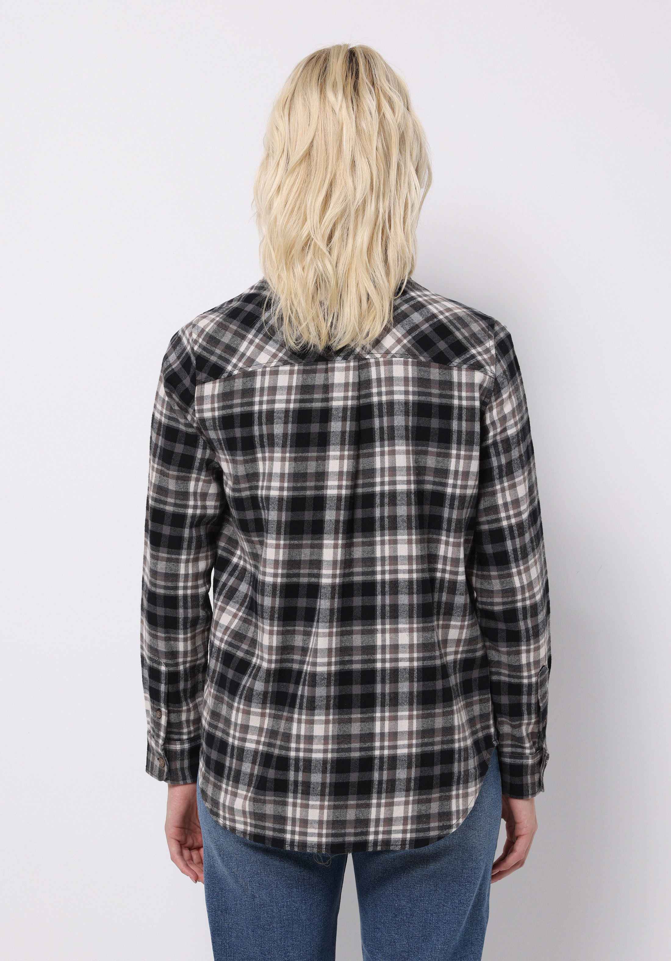 Regular Fit Shirt Neck Ekoseli Kadın Siyah Uzun Kol Gömlek