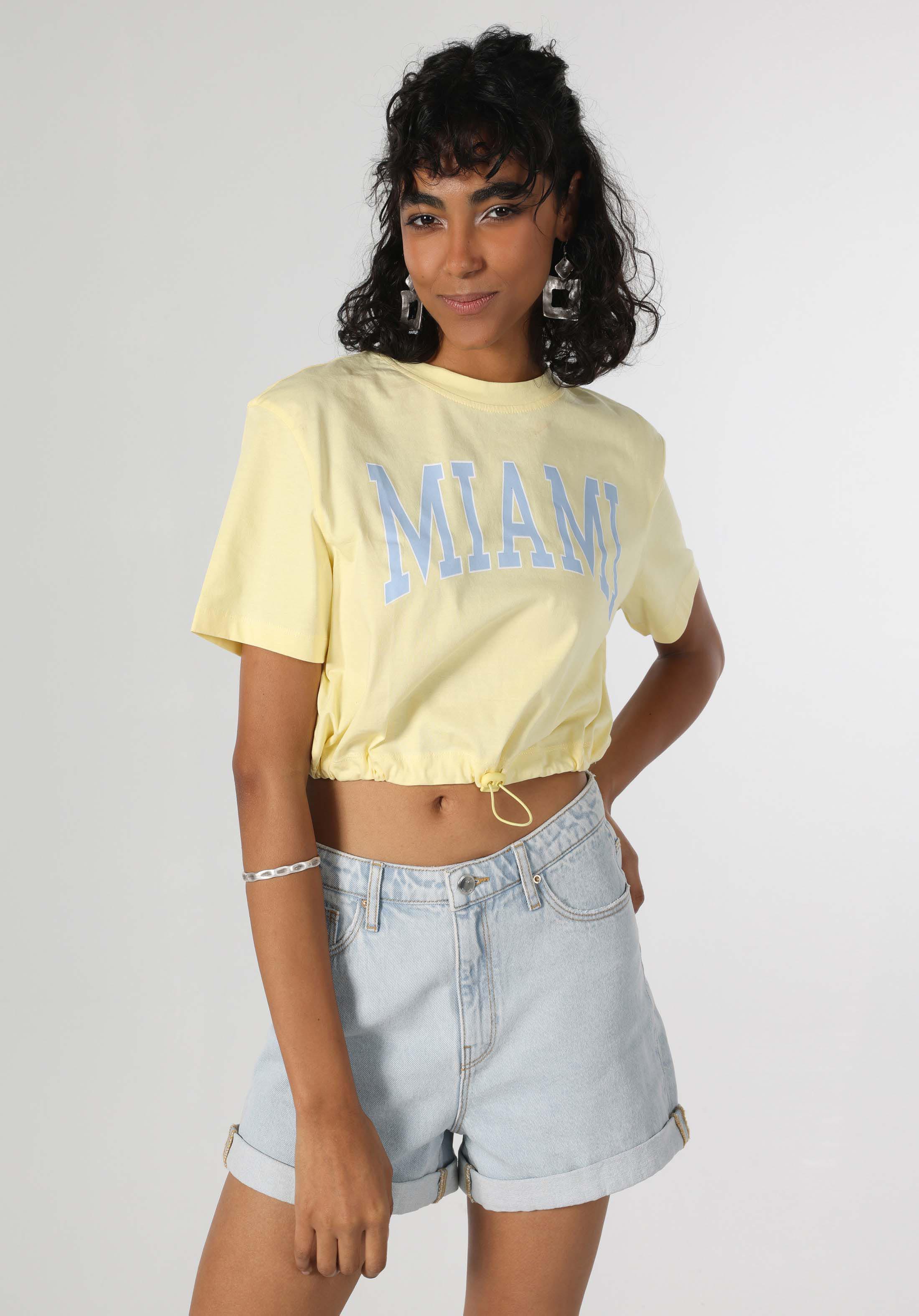 Regular Fit Yuvarlak Yaka Miami Baskılı Kadın Sari Kısa Kol Tişört