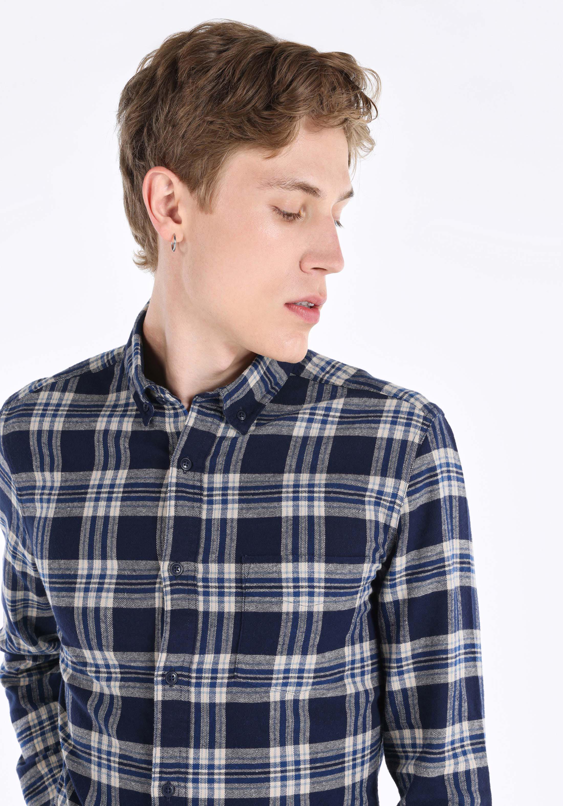 Slim Fit Shirt Neck Ekoseli Erkek Lacivert Uzun Kol Gömlek